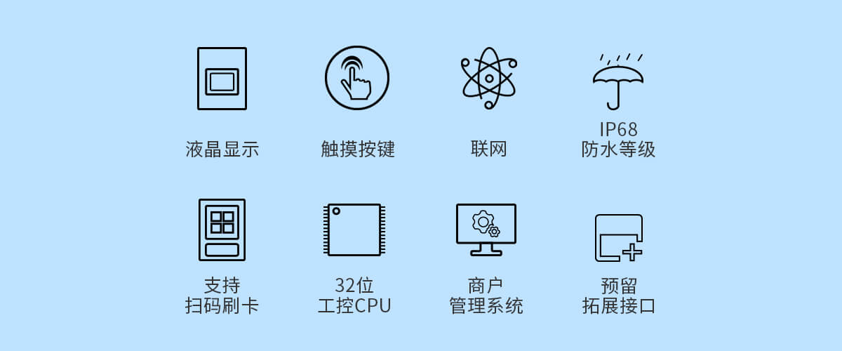 • 支持掃碼消費(fèi),預(yù)充值,微信支付寶即時(shí)消費(fèi),支持云卡、儲(chǔ)值卡消費(fèi);